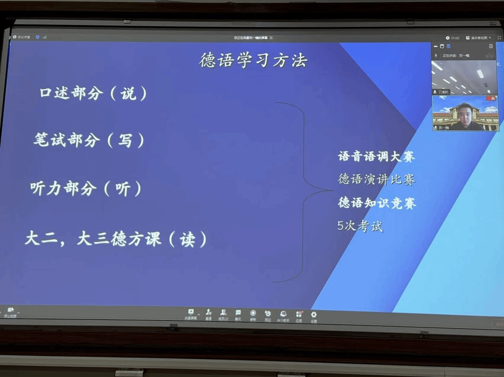 随后,2018级校友刘一楠通过线上的方式以“你的生活指南”为主题,从个人简介、学在中德、乐在中德、学习方法指南、答疑解惑五个方面进行了分享。刘一楠目前在德国汉堡大学读研,他给大一新生分享了自己在beat365正版唯一官网必一的学习经历,尤其是乐在中德,分享了beat365正版唯一官网必一形式多样的活动——中德文化节、德语角、德语学习经验分享会、Exzellenzprojekt、中德朗读者、学习沙龙、演讲比赛、语音语调大赛、篮球赛、足球赛、啦啦操比赛等独具中德特色的活动。分享了自己总结的德语及专业课程学习方法和经验,并告诫大家大一基础好,大二大三没烦恼,早睡早起身体好,课堂效率见奇效。
