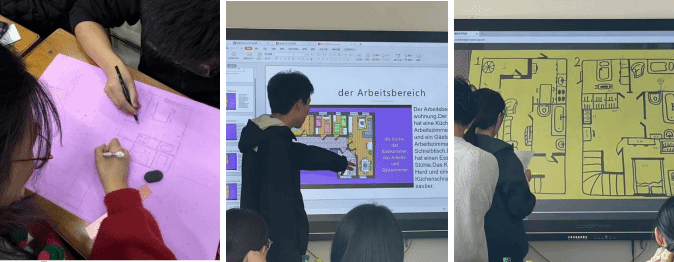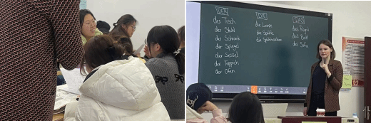 每周的教学过程中都有学生和德国外教交流的时间和机会。本周外教进班期间,重点对口语和词汇进行了练习,外教Frau Steiner在授课过程中介绍了几种词汇练习方式,如按照词性将同一主题下的词汇归类,按照可搭配动词将词汇归类记忆等方法。既让学生多次反复记忆单词,又能为学生之后词汇的学习提供可行思路。在口语练习中,外教以“讨论+作画”的方式,新颖而生动地让学生掌握句型和词汇,受到了学生的认可和欢迎。