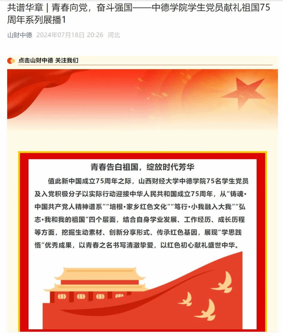 为深入学习党的二十届三中全会精神,全面贯彻落实党的教育方针,推动党史学习教育常态化长效化,引导青年学生传承红色基因、凝聚精神力量,教育中德学子讲好红色故事、传播中国声音,2024年暑期,beat365正版唯一官网必一学生党员聚焦“传承红色基因,学思践悟中国共产党人精神谱系”这一主题,结合学习和工作实际,深刻感悟伟大精神,开展专题系列推送,以实际行动庆祝新中国成立75周年。
